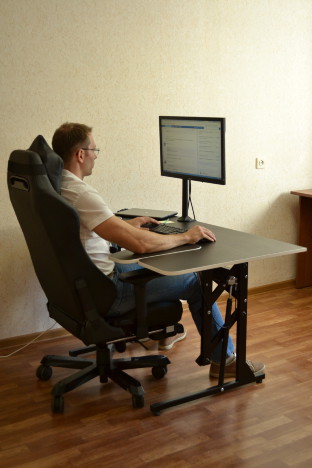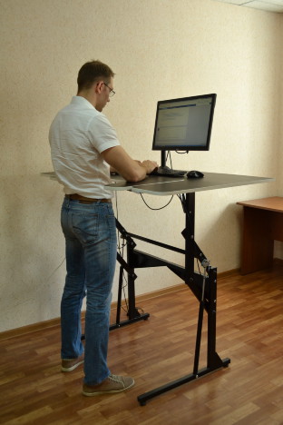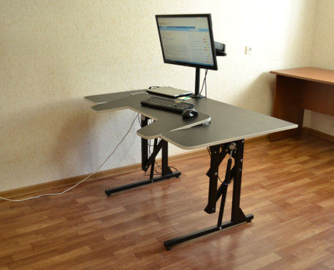 Предсерийный образец. Конструкция еще нуждается в доработке. Газлифты слишком слабые, реальная грузоподъемность не более 20 кг, если больше - приходится подталкивать стол рукой. Люди выше 185 см в положении "сидя" упираются коленями в ребро жесткости между опорами.